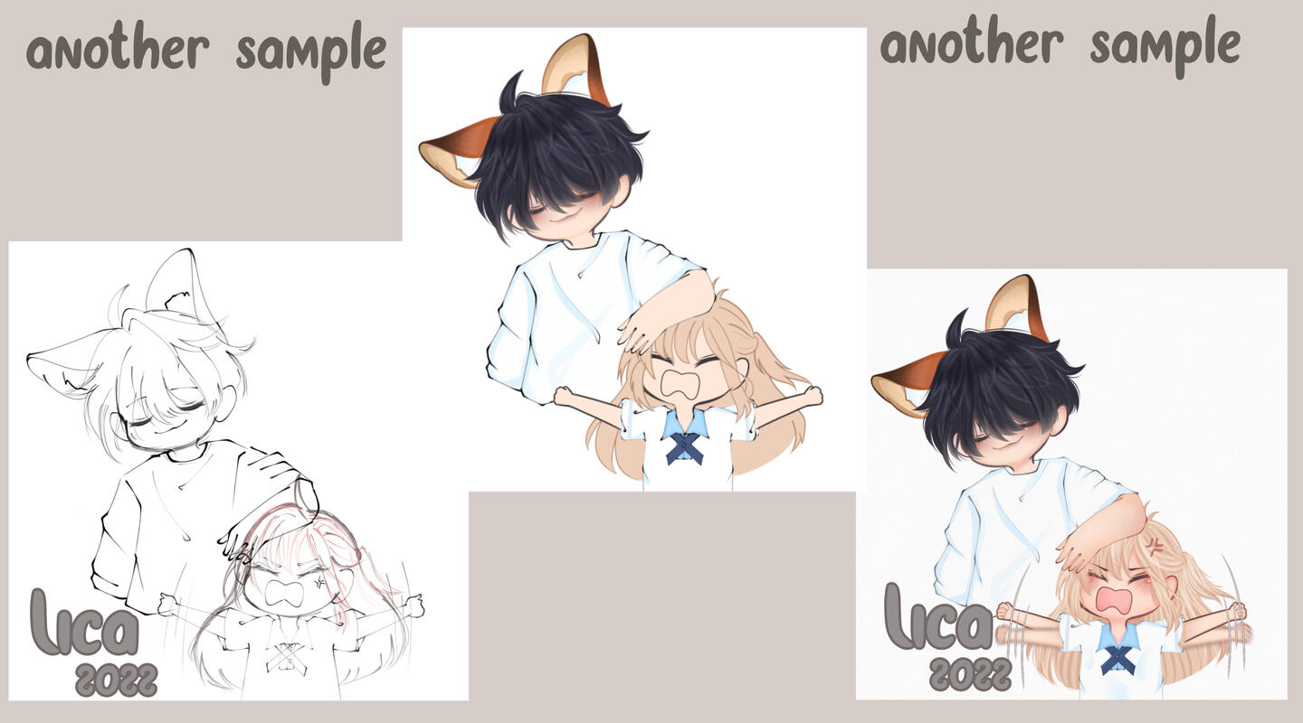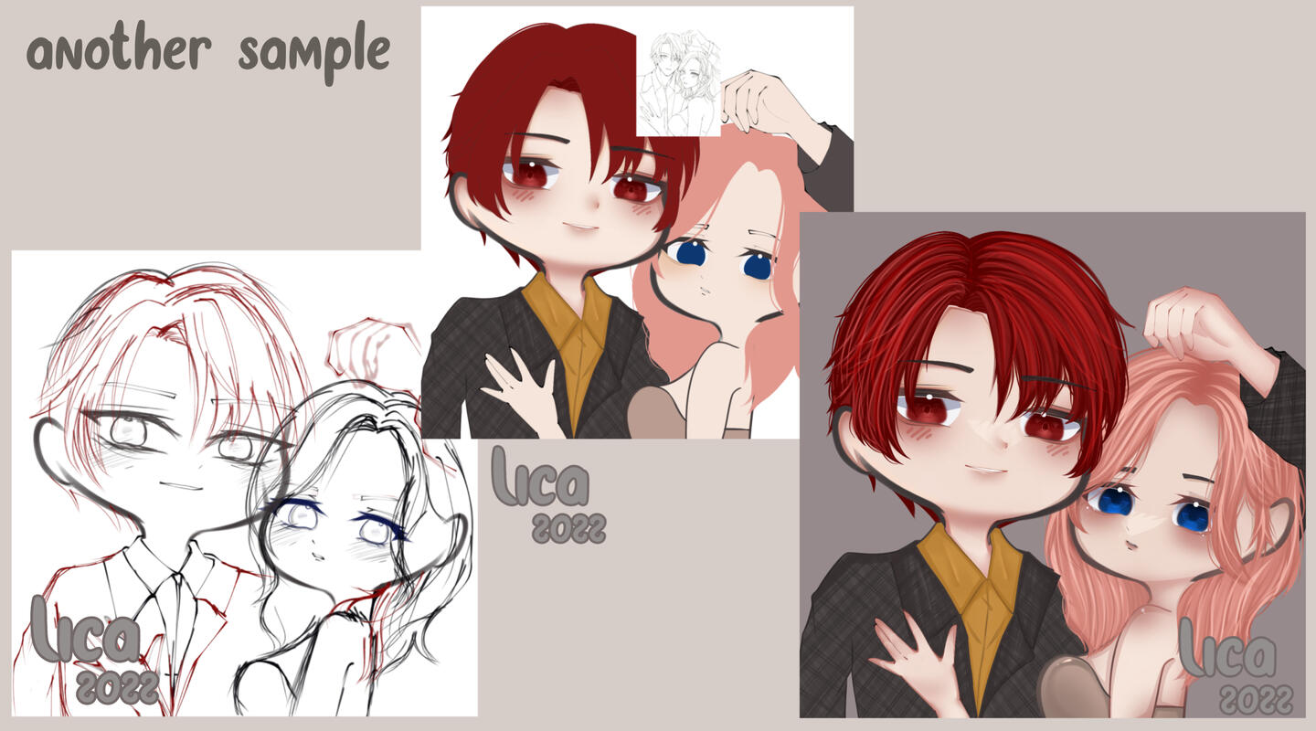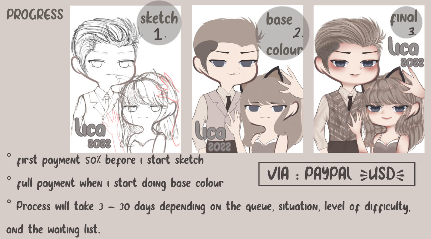 – (Commercial : half body - knee up ×2)⋆ Canvas size is above 1500px and 300 DPI/Up⋆ Please be aware of COPYRIGHT issues before sending the references.⋆ Process will take 3 - 30 days depending on the queue, situation, level of difficulty, and the waiting list.⋆ The results are sent as email, JPG and PNG, without watermark.⋆ The result will be uploaded in my social media, you can tell me if you don't want it.